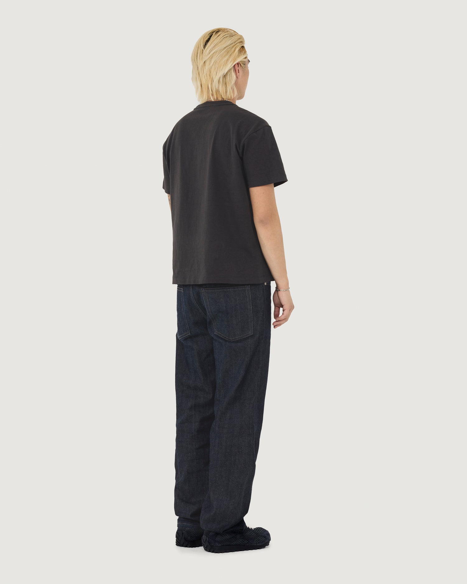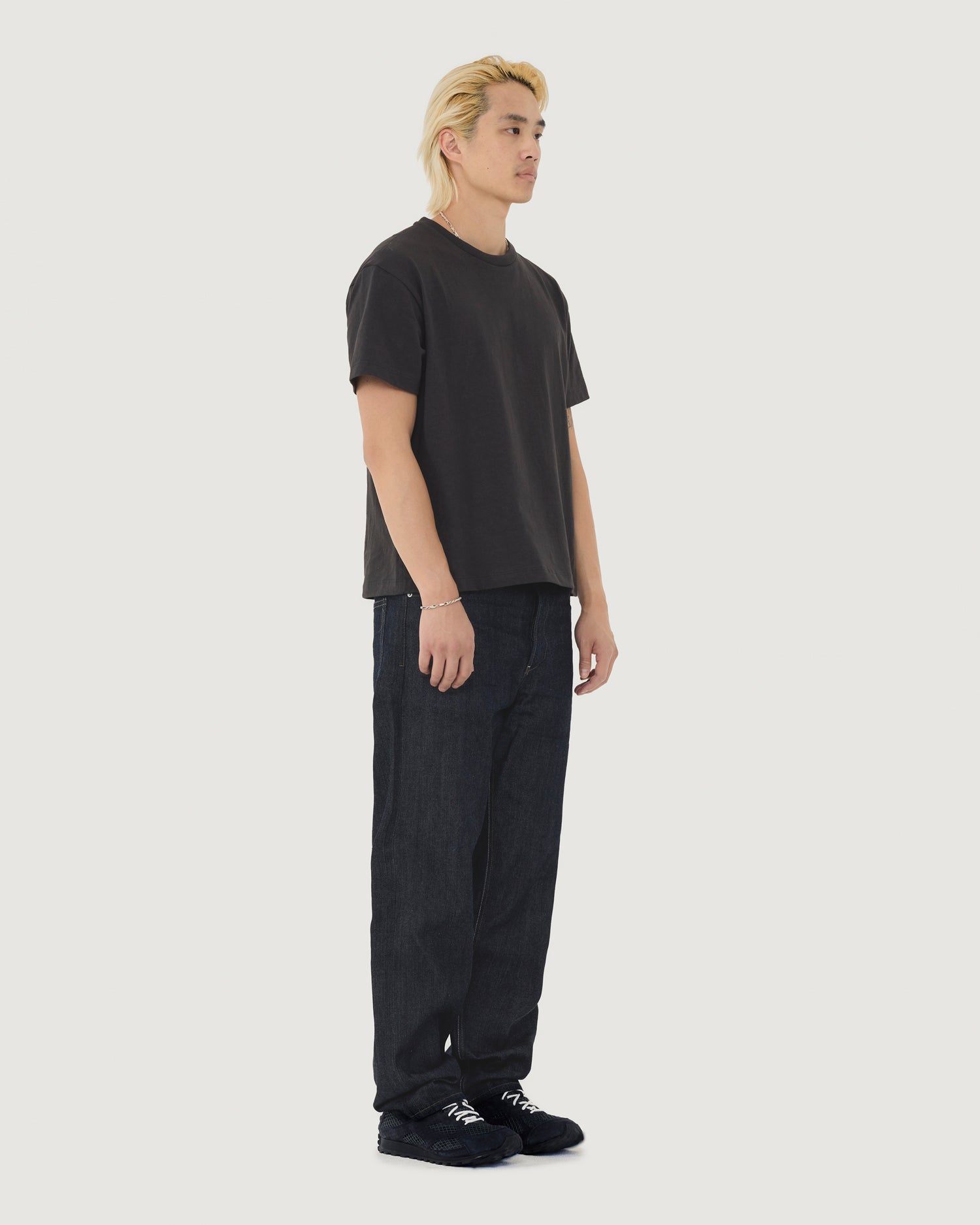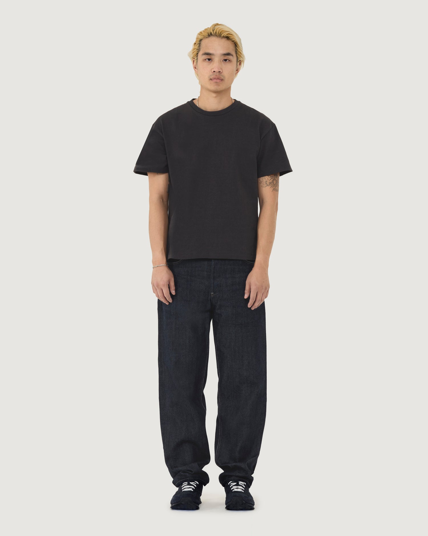 The shoulder and side panels are sewn together using a butterflied seam. This construction detail is inspired by the outseams on selvedge denim.